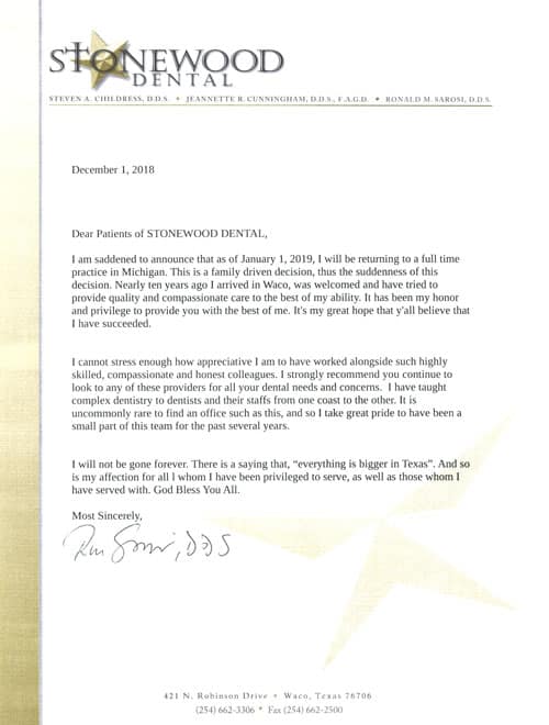 It is with great sadness that we say farewell to Dr. Ronald Sarosi. He has been a member of our team and helped us provide quality dental care in Central Texas for the last decade. While we are sad to see him go, we wish him well as he returns to his full time practice in Michigan. Thank you for being a member of the Stonewood family, Dr. Sarosi. You will be greatly missed!